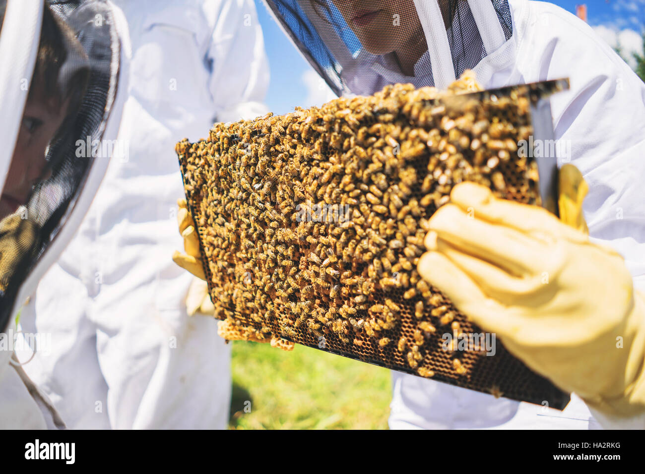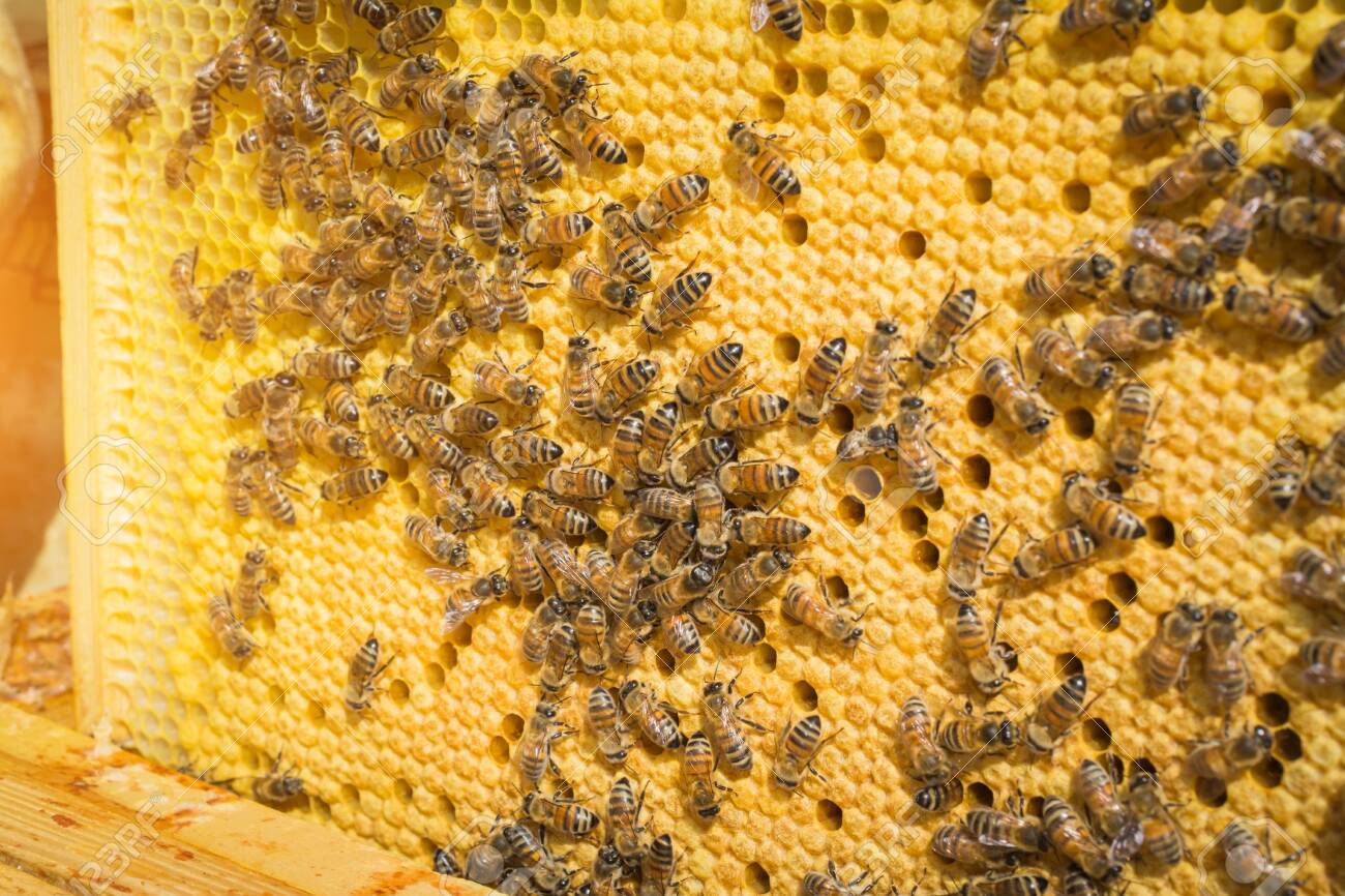 Bees Teamwork : Queen bee lays eggs in the honeycomb.