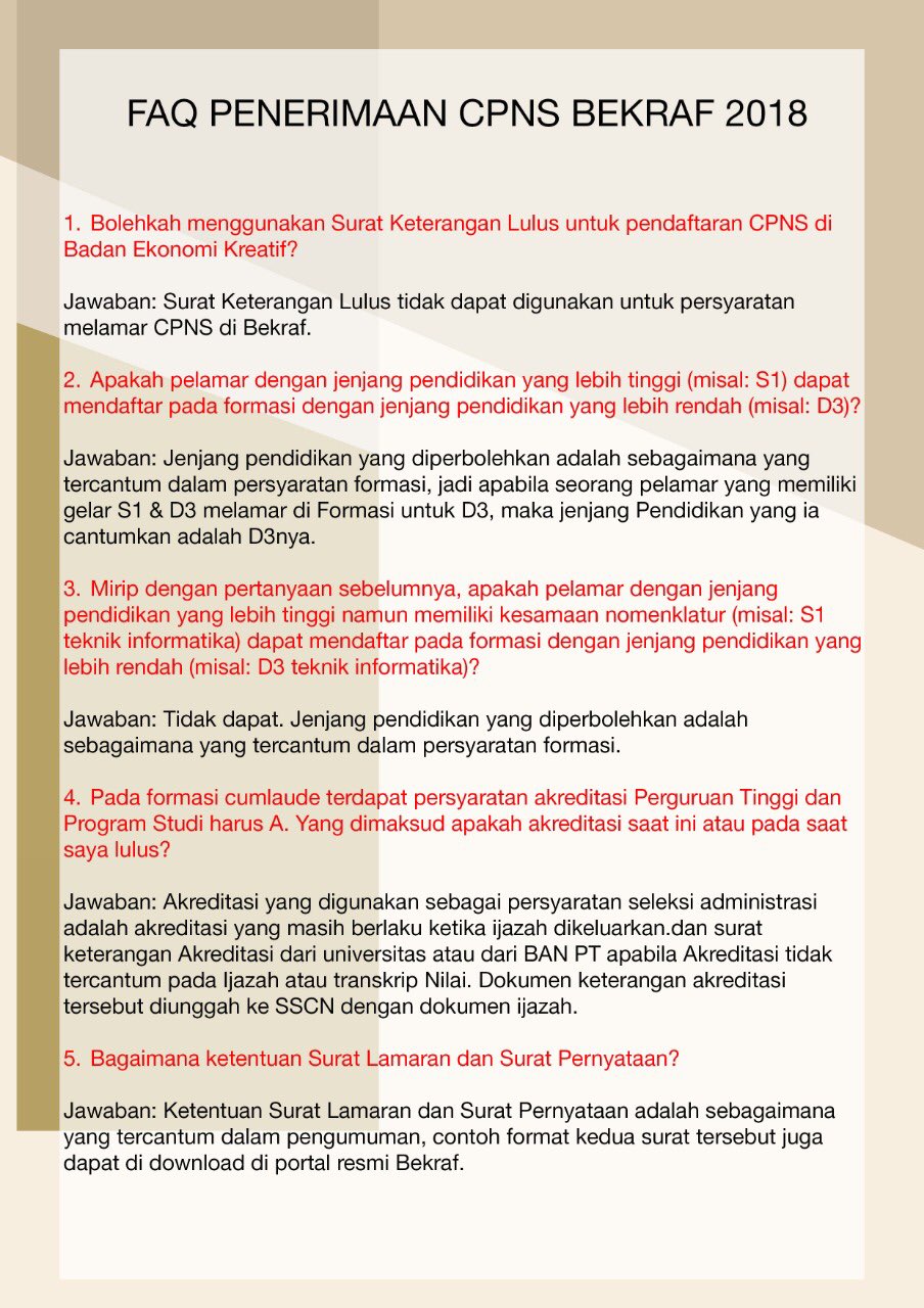 Badan Ekonomi Kreatif On Twitter Seleksi Cpns Tahun 2018 Bekraf Akan Menerima 100 Putra Putri Terbaik Bangsa Dengan 25 Jabatan Bagi Para Pelamar Berikut Beberapa Penjelasan Untuk Pertanyaan Yang Sering Kami Dapatkan Terkait - Harian kompas adalah surat kabar indonesia yang berkantor pusat di jakarta.